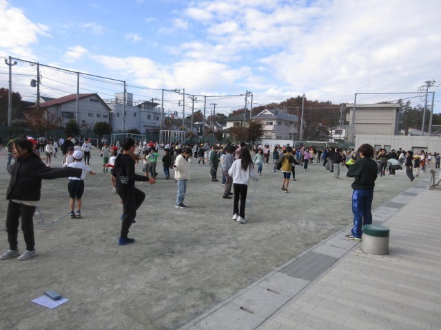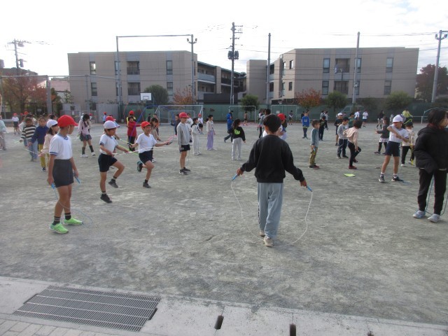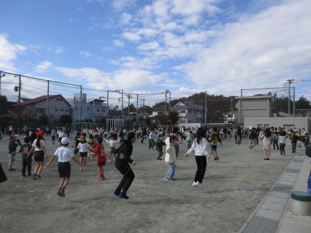 寒空の下、冬場の体力づくりとして全校児童が短縄とびに励むピョンピョン期間が始まりました。持続的な短縄とびへの取り組みを通して、リズミカルに動くために力を調整しながら運動する力を育むことねらいにしています。内容は、1.前とび 2.後ろとび 3.かけ足とび 4.前振りとび 5.あやとび 6.交差とび 7.二重とび 8.好きなとび方 を行っています。第1回:11月18日(火)~11月28日(金)、第2回:12月 8日(月)~12月19日(金)を実施期間として楽しみながら短縄とびに挑んでいきます。