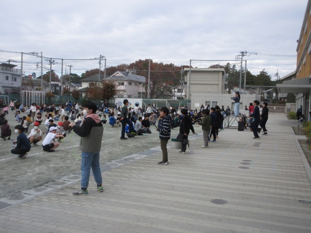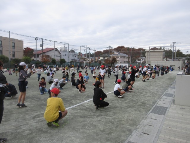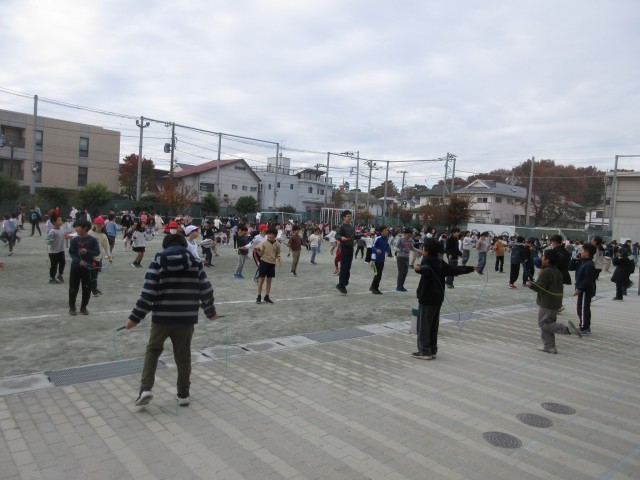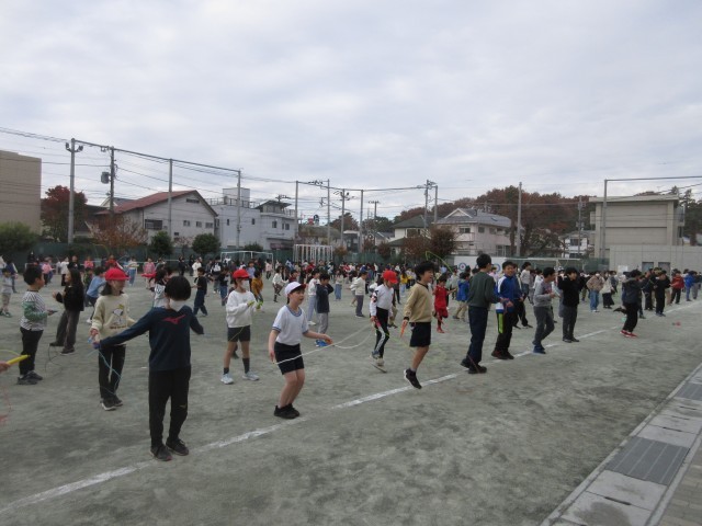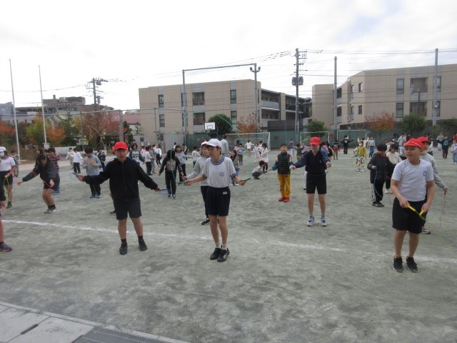 11月20日、寒空の下、朝の活動時間に体育委員会が中心となってわくスポを行いました。最初に体育委員がお題を出して該当する人だけが跳ぶ「お題縄跳び」、最後に全校児童で縄跳びをしました。
