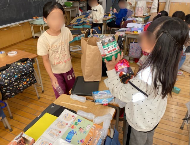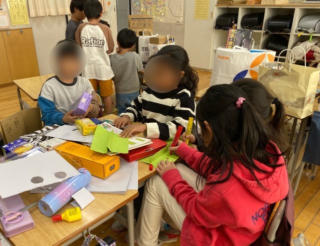 2年生の生活科では、家から持ってきた材料を使って、おもちゃづくりをしています。