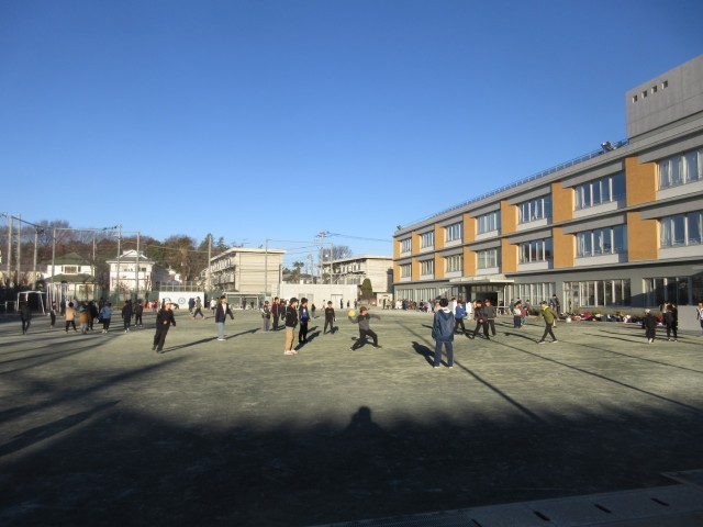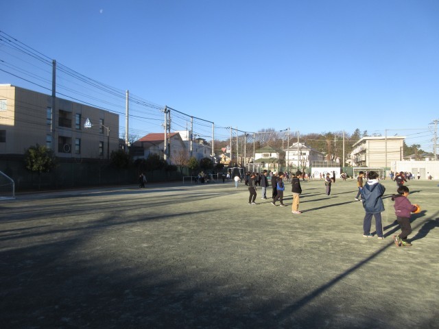 1月9日、3学期が始まって2日目、厳しい冷え込みですが子どもたちは校庭で朝遊びを楽しんでいます。寒さのため、せせらぎ周辺の畑では霜柱や氷が見られます。大人気のエベレストは改修工事が終わるまで使えません。