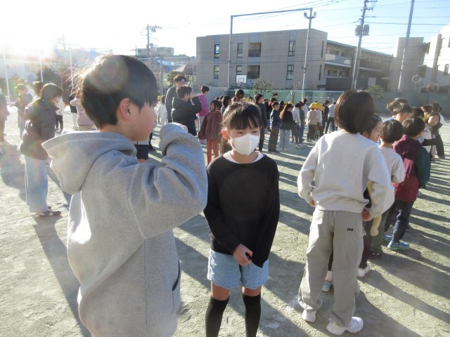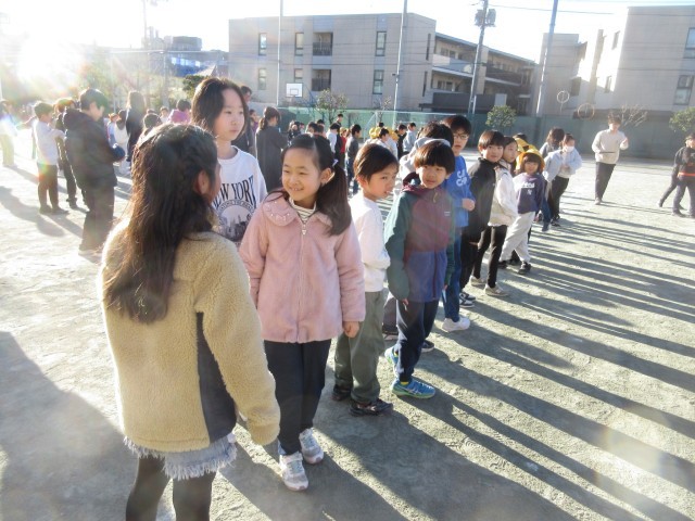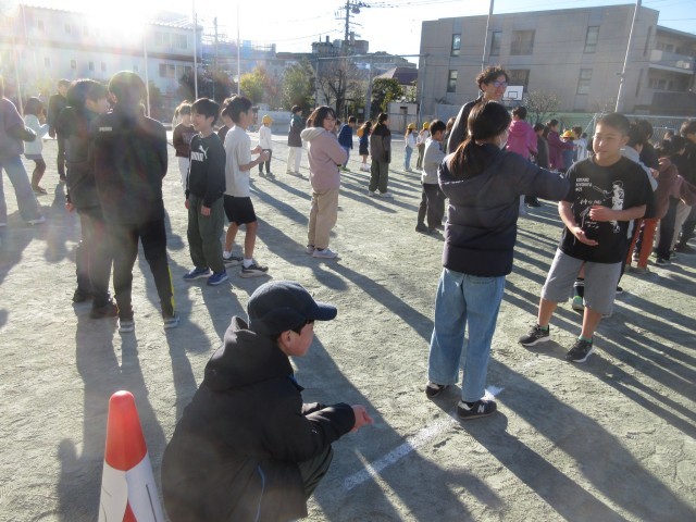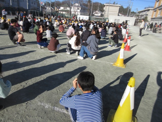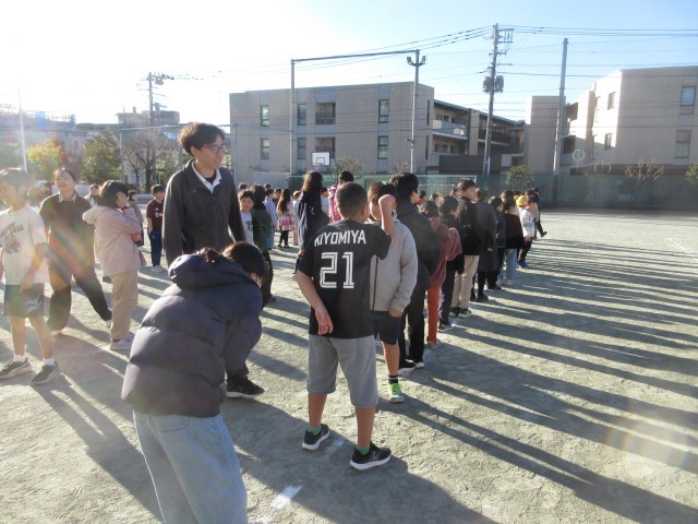 1月22日、寒空の下、朝の活動時間に校庭で体育委員会によるわくスポを行いました。子どもたちは18の縦割り班に分かれて先頭の子からジェスチャーでお題を伝えていきました。最後の子まで正解を伝えることが難しかったですが楽しみながら活動できました。