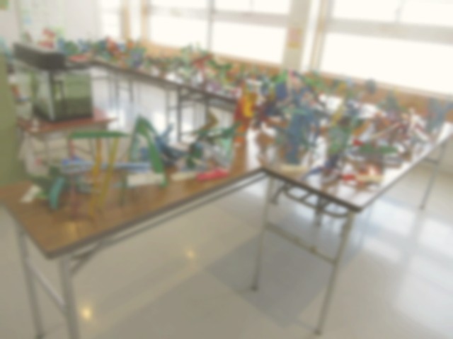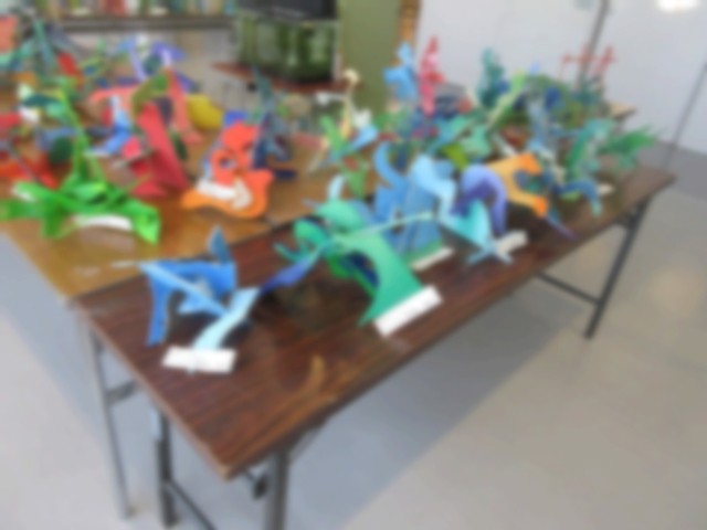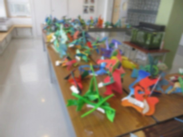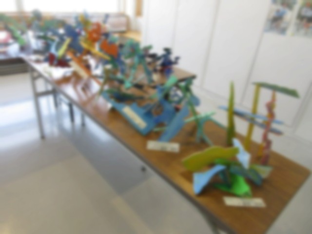 5年生が図工授業で制作した題材「進め!糸のこたん検隊」の作品を5年教室前のフリースペースに展示しました。電動糸のこで板をカットしながら偶然できた不定形の形に思い思いの色を塗った立体作品です。全員の作品を展示することで不思議な空間を演出できました。