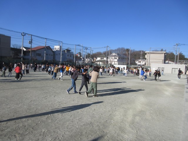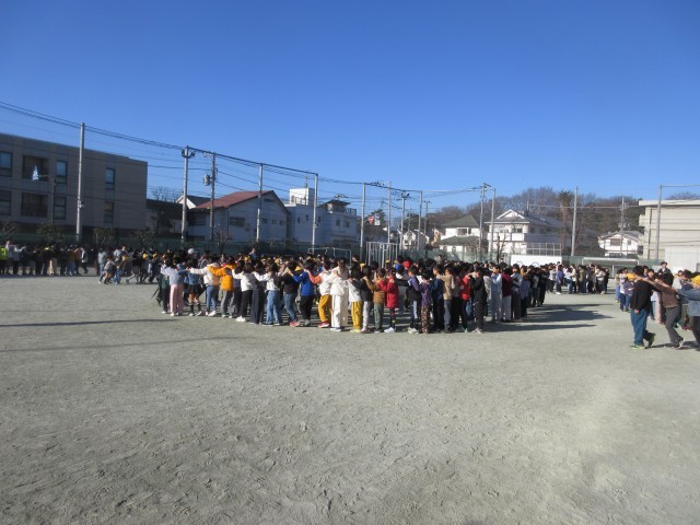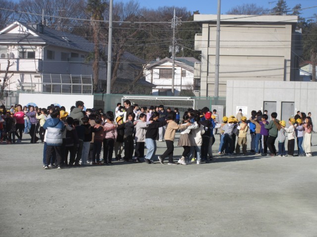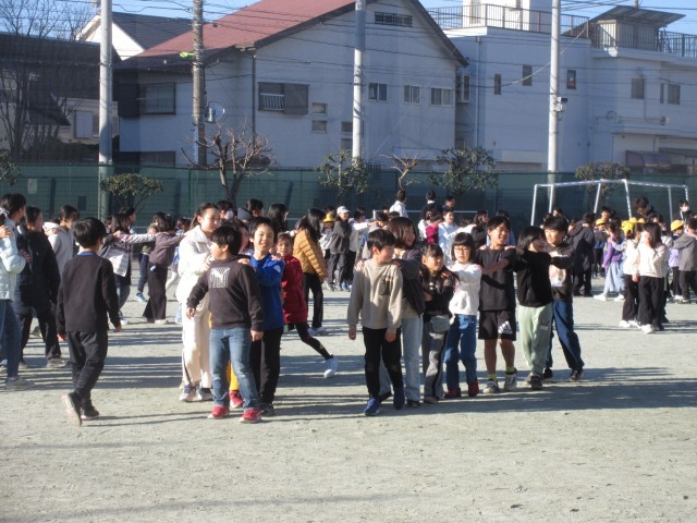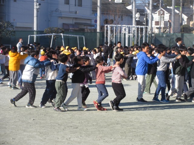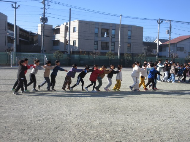 1月29日、朝の活動時間に集会委員会による児童集会を行いました。お題は「じゃんけん列車」、寒空の下で子どもたちは歓声をあげながらじゃんけん列車を楽しみ、長い列車を作りました。