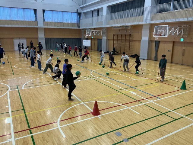 5年生もクラッチを両手に持ち、片足だけでボールを蹴る体験をしました。クラッチをつきながら走るのは大分上手になりましたが、ボールを片足だけで止めたり蹴ったりするのは、かなり難しそうでした。
