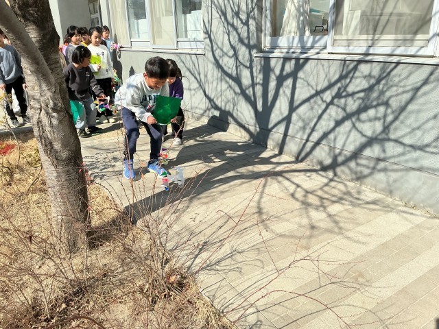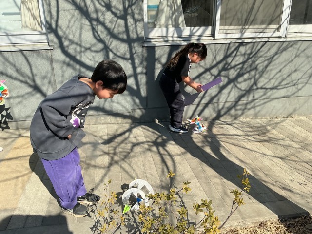生活科の時間に紙皿を使って、「かざわ」を作りました。転がった時に、キレイに見えるように色の塗り方を工夫しました!今日の校庭は、あまり風がなかったので、下敷きにも手伝ってもらって「かざわ競走」をしました!