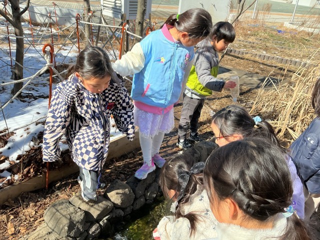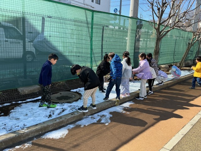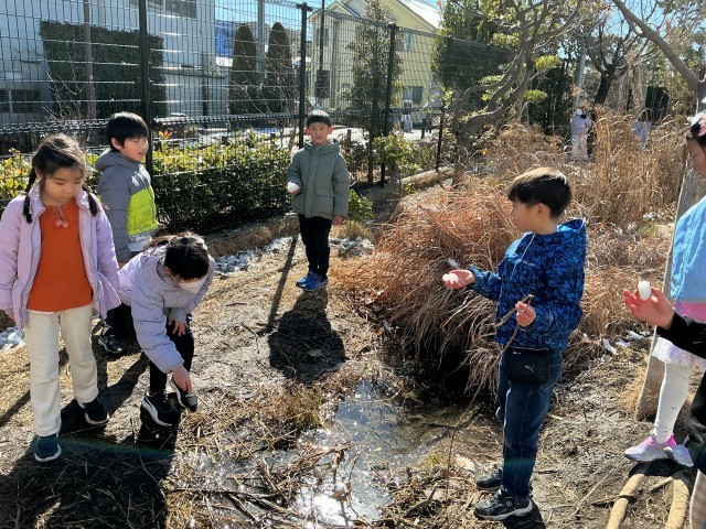 週末に都心では珍しい、積雪がありました。そこで、早速校庭やせせらぎに出て観察をしました。「雪をせせらぎに流してみよう」、「それなら競争しよう」、「どんどん透き通ってきれい!」、「水の方があったかい」などなど。。。さすが子どもたち!!積雪があったことで、たくさんの気付きや学びがありました!