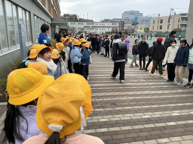 今週のあいさつ当番は、1年生と4年生です。寒空の下でしたが、みんな元気にあいさつをしていました!