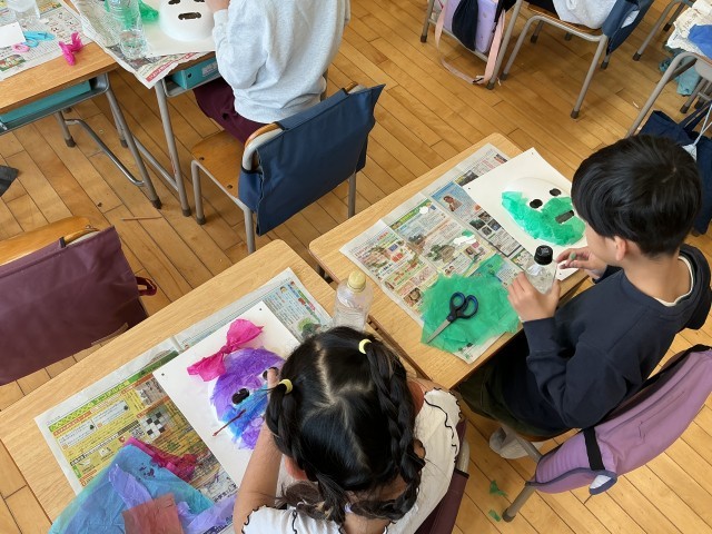 図工では、お面作りを行いました。作品に個性が表れていました。お面に耳をつけたり口を大きくしたりして形を工夫したり、花紙で配色を考えたりました。夢中になって取り組んでいました。