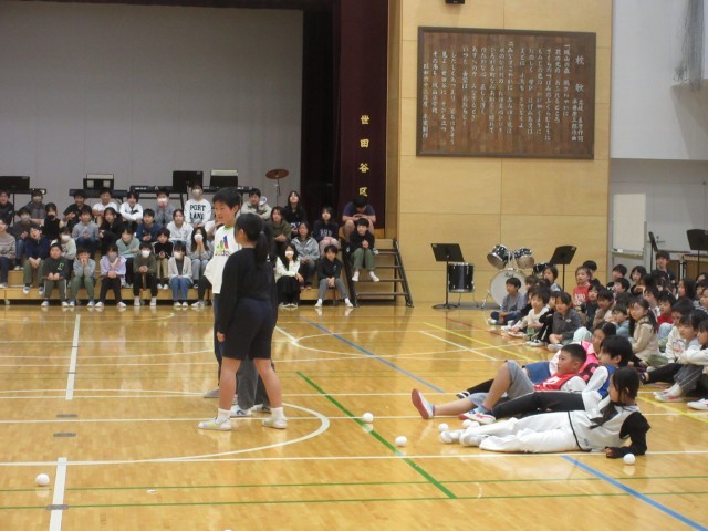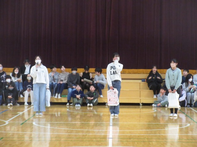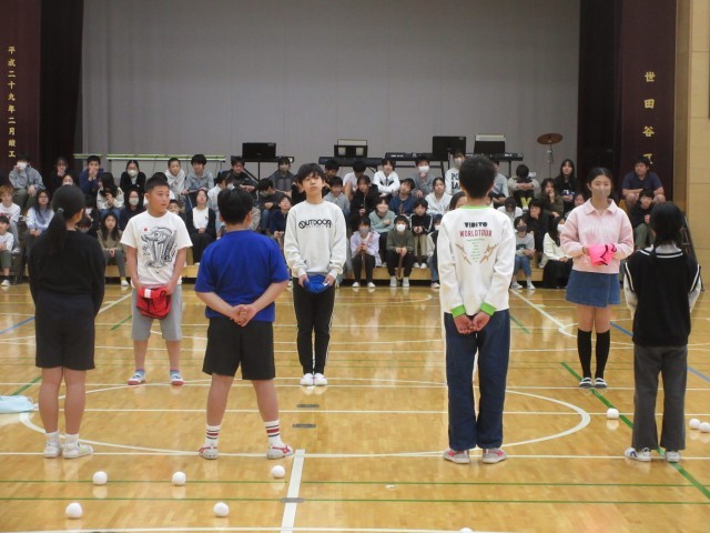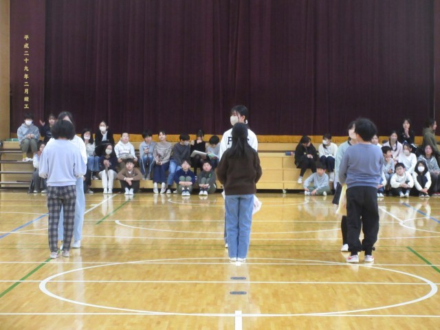 運営代表委員が寸劇「城山レンジャー」を演じ、最後に6年生から5年生へ城山レンジャーのビブスが渡されました。縦割り班で活動してきた18人の5年生から6年生の班長へ皆が書いたメッセージカードを贈呈しました。6年生からは在校生へ記念品として手作りの雑巾が贈られました。