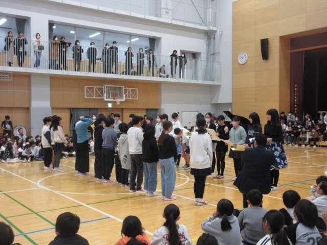 6年生を送る会(運営代表委員、縦割り班のメッセージカード渡し、6年生から記念品の贈呈)