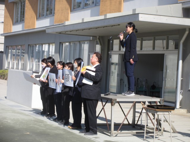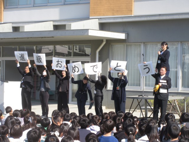 生活指導担当からの先生から春休みに安全で快適に過ごすため心がけることについてお話がありました。そしてお話の語呂合わせから「進級おめでとう」のメッセージプレートを掲げました。