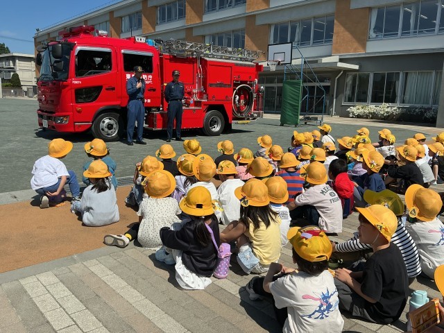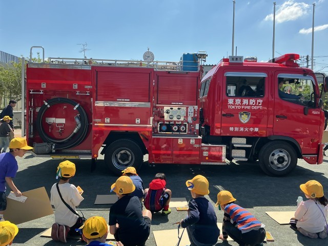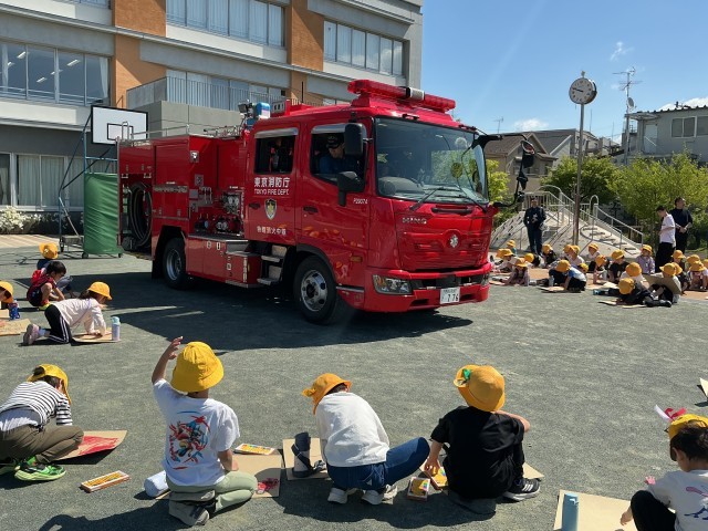 当日は、世田谷消防署松原出張所からポンプ車1台と消防隊員の方に来ていただきました。子どもたちは、ポンプ車を目の前にして目を輝かせていました。「よく見て、大きくかく」ことをめあてに、1時間しっかり描くことができました。
