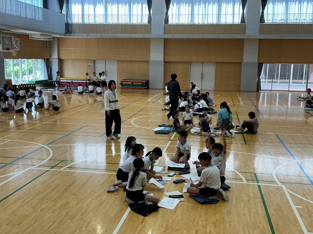 たてわり班18班に分かれてオリエンテーリングをするので、顔合わせをしました。4年生はカラフルな班の看板を作って、やる気満々でリードしていました。自己紹介をしたり、役割分担をしたりするうちに、あっという間に仲良く話をするようになりました。遠足の日が楽しみです。