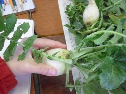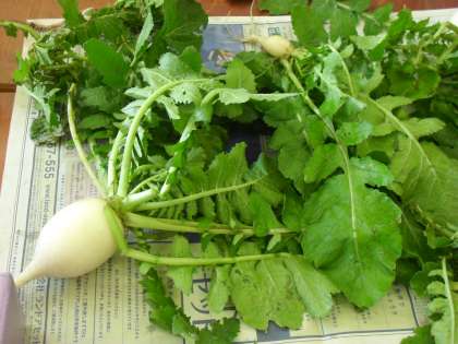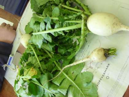 冷たい水で土を落とすと、なんと光るような白い大根になりました。「おいしそう、早く食べたい。」「葉も食べれるんだよ。」と、みな大切そうに持ち帰りました。どんなお料理でめし上がったでしょうか?