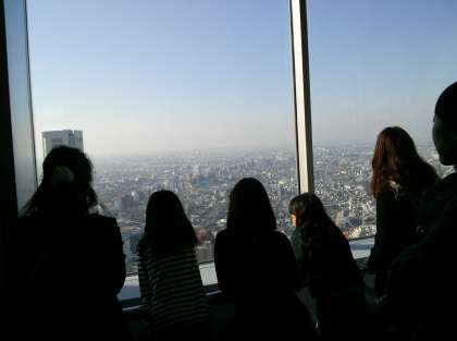 展望台からは、都庁の回りのようすがよく見渡せました。残念ながら、霞がかかっていたので富士山はのぞめませんでした。中国人や韓国人の観光客、修学旅行生もたくさん来ていました。