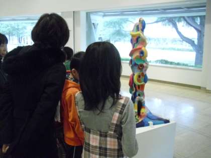 様々な形の芸術に触れ、その作品の意味や伝えたいことを一生懸命考えながら鑑賞しました。子どもたちからは「何でここは、この色なんだろう」「これは○○に見える!」など、作品に対する感想が、いろいろなつぶやきとなって出てきました。美術館内では、案内のボランティアの方々に説明をしていただきながら、グループごとに行動しました。自分で見ているだけではわからなかった作品の背景なども教えていただくことができました。学校に戻ってきて、「一番印象に残っている作品」を聞いてみると、一人一人全く違う作品を選んでいたことから、人の感性の違いについても考えることができました。