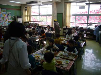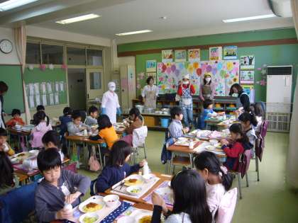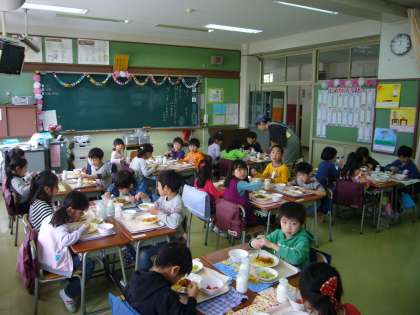 4月11日(木)から、1年生の給食が始まりました。この日のメニューはスパゲティーミートソース、春キャベツのサラダ、いちご、牛乳でした。1年生は、「給食、おいしい!!」と、目を輝かせて、食べていました。