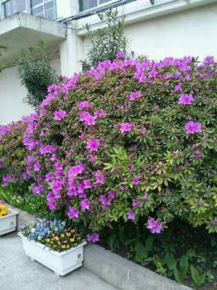 プール門から入った通路の両脇に、オオムラキツツジの木があります。4月の下旬から咲き始め、満開になりました。その足元には、スズランが可憐な花を咲かせています。