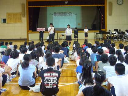 はじめに、体育館で生徒会から中学校の1年間の生活や制服の説明を受けました。その後、吹奏楽部の演奏を聴きました。(吹奏楽部には、本校の卒業生がたくさん入部しています。)