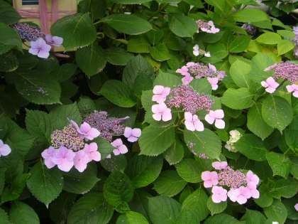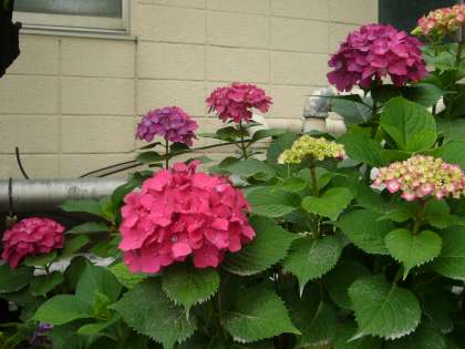 梅雨の季節に元気に花を咲かせるのは、アジサイです。学校にはアジサイの木がたくさんあります。