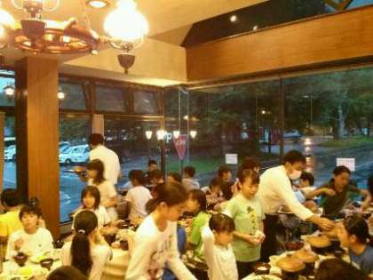 2日目の夕食です。ハイキングで頑張ったので、おいしいです。4時前から、雷雨が激しくなってきました。ナイトハイクは、館内で行うことになりました。