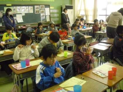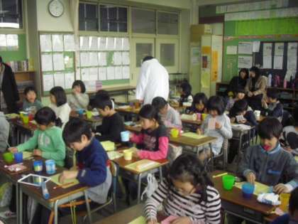 教わった歯磨きの仕方で丁寧に歯を磨く子どもたちの表情は真剣そのものです。一生懸命磨くと、歯磨きに7分以上もかかるということがわかりました。
