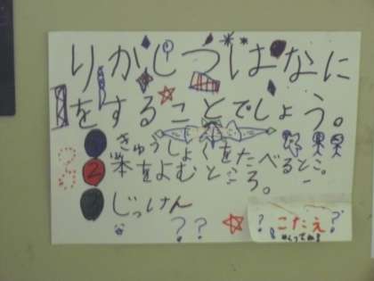この日までに、2年生は、各施設や教室にふさわしいクイズを考え、各場所に掲示しました。当日は、4,5人の1,2年合同のグループで回りました。約束は、トイレに行くときは2年生も一緒に行く、手をつなぐ、走らないなど子ども達が考えて、守ろうとしていました。
