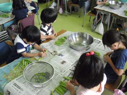 本校では、食育の一環として、毎年この時期になると、1年生がさやむきを行います。