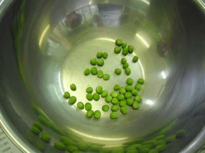 手を洗って、席に座り、くばられたグリンピースのさやを見つめます。