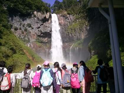 8時10分、華厳の滝に到着しました。エレベーターで100mを一気に下り、滝を間近に眺めます。