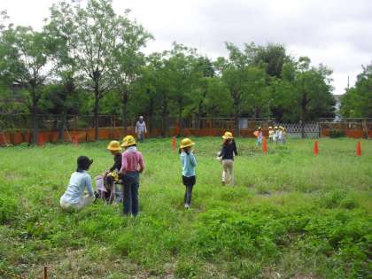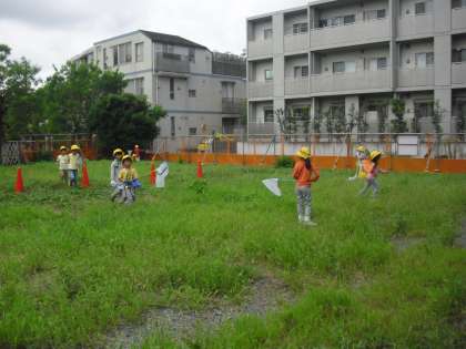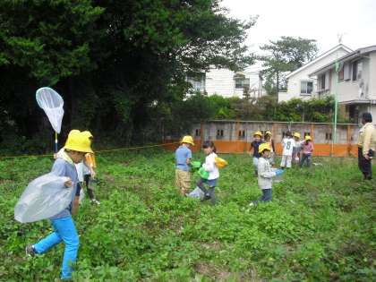 1年生の生活科の学習で、9月5日(金)の午前中に虫探しにでかけました。当初、羽根木公園を予定していましたが、校庭南側のマンション建設予定地が絶好の草むらになっている様子をみて、急きょ建設業者の方に相談した結果、ご厚意で入らせていただくことができました。7〜8センチもある大きなバッタやコオロギの赤ちゃんなど、たくさんの虫を見つけて、1年生は大喜びでした。3年生も、この草むらで虫探しをさせていただきました。