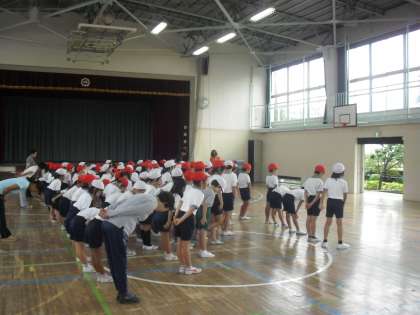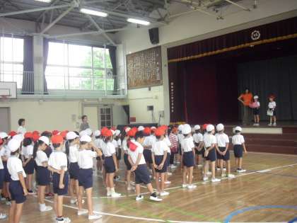プールおさめは、雨天のため体育館で行われました。1年生の代表の言葉では、一夏で泳げるようになった成長や、来年に向けた目標を話してくれました。夏の短い間、プールの授業を、みんなで安全に楽しく行うことができました。プールに感謝の気持ちを込めて「ありがとうございました!」とお礼を言いました。