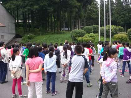 なかのビレジに到着して、北沢小学校と合同で開室式です。