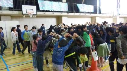 始めの言葉、校長先生の話に続き、たてわり班でグループをつくり、ジャンボカルタを行いました。(体育館中央に置かれた大きなカルタを、2,3人のグループで取りに行きます。)