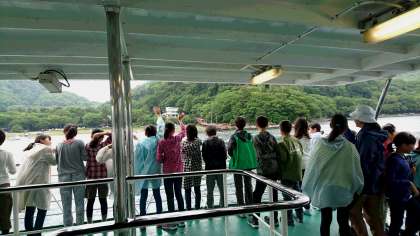 竜頭の滝から歩いて菖蒲が浜まで歩き、遊覧船に乗りました。今は、雲っていますが、雨が、時々降り始めます。