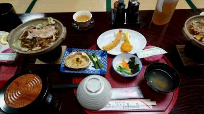 買い物と入浴を済ませて、夕食の時間となりました。ハイキングでお腹がすいたようで、みんな待ちかねていました。