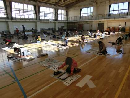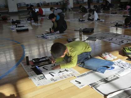 本日3,4時間目に書き初め大会を行いました。「春の海」の優雅な琴の音が流れる体育館で筆遣いに苦戦しながらも一生懸命「つよい力」を書き上げました。