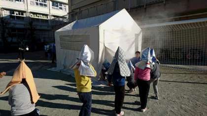 平成29年1月16日(月)に避難訓練を行いました。今回は、家庭科室から出火したという想定で、校庭に避難しました。例年煙体験は、校舎内の廊下に煙を充満させて行ってきましたが、今回から、北沢総合支所地域振興課にお願いして、煙体験ができるテントを校庭に設置していただきました。「姿勢を低くする。」「右手にハンカチを持ち、鼻と口をおおう。」「左手でテントをつたう。」の3つのことに気をつけて、1・3・5年生が、白い煙が充満するテント内を歩きました。今後も、毎年1・3・5年生で煙体験を実施していきます。