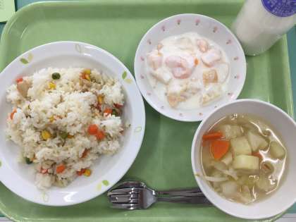 献立 三色ピラフ ベーコンと野菜のスープ フルーツヨーグルト 牛乳