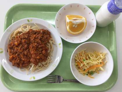 献立 ミートソーススパゲティ じゃがいものハニーサラダ くだもの 牛乳