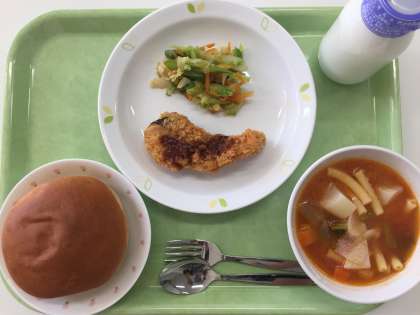 献立 ミルクパン メルルーサのフライ 春野菜のサラダ ミネストローネ 牛乳