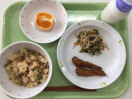 献立 鶏五目ごはん にぎすのカレー揚げ 野菜のごま酢和え 清見オレンジ 牛乳
