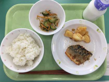 献立 ご飯 さばのピリ辛焼き じゃが芋の甘辛煮 こんにゃくサラダ 牛乳