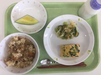献立 きんぴらご飯 卵焼き 野菜のおかか和え メロン 牛乳