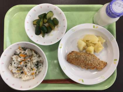献立 わかめご飯 鮭のごまフライ きゅうりの南蛮漬け 粉ふきいも 牛乳