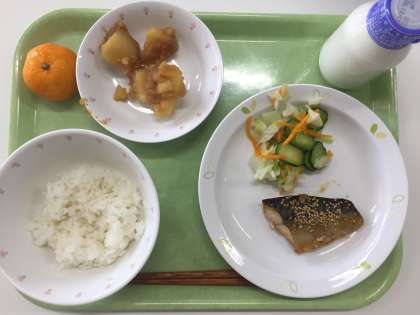 献立 ご飯 さばの梅だれ焼き ひとしお野菜 じゃが芋の甘辛煮 冷凍みかん 牛乳