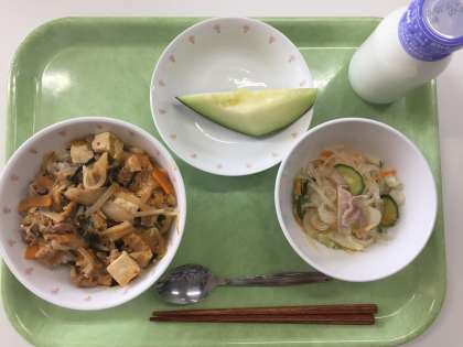 献立 豚キムチ丼 春雨サラダ メロン 牛乳