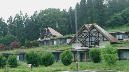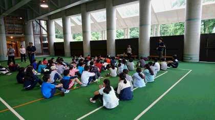 ヒロイド原散策からもどり、これから屋根付き広場で室内レクをします。外は、まだ雨が降っています。