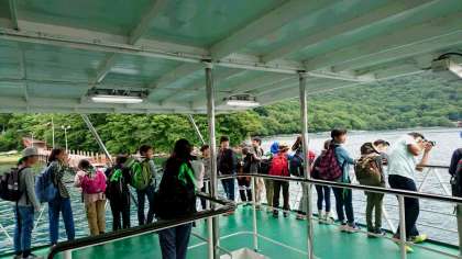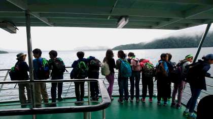 昼食後、菖蒲が浜から遊覧船に乗って、中禅寺湖をめぐります。霧が出ていたので、出港が危ぶまれましたが、出ることになりました。