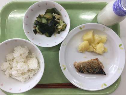 献立 ご飯 さばのピリ辛焼き 粉ふき芋 浸し豆とわかめのサラダ 牛乳